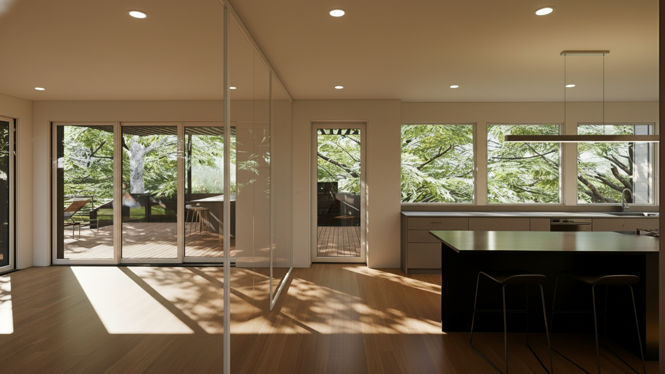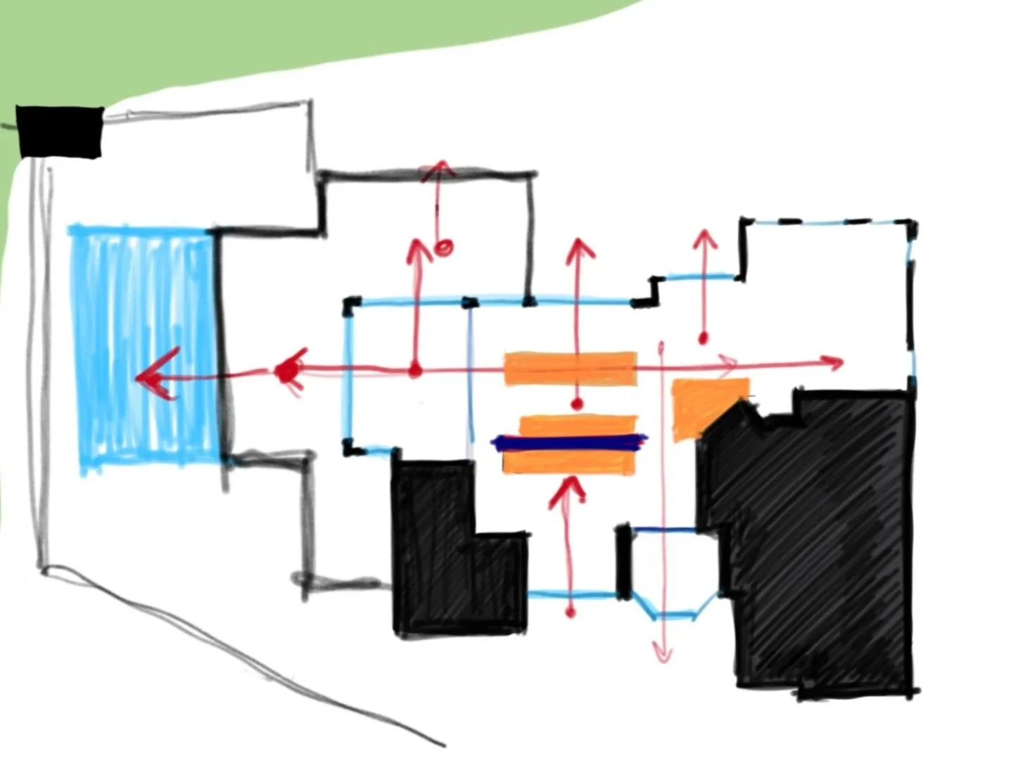 This renovation reorganizes the home into a series of open, flowing rooms defined by views, movement, and purposeful objects. New sliding doors and expanded exterior openings strengthen the connection to the outdoors, extending the living spaces to a new pool, pergola, deck, and outdoor kitchen.